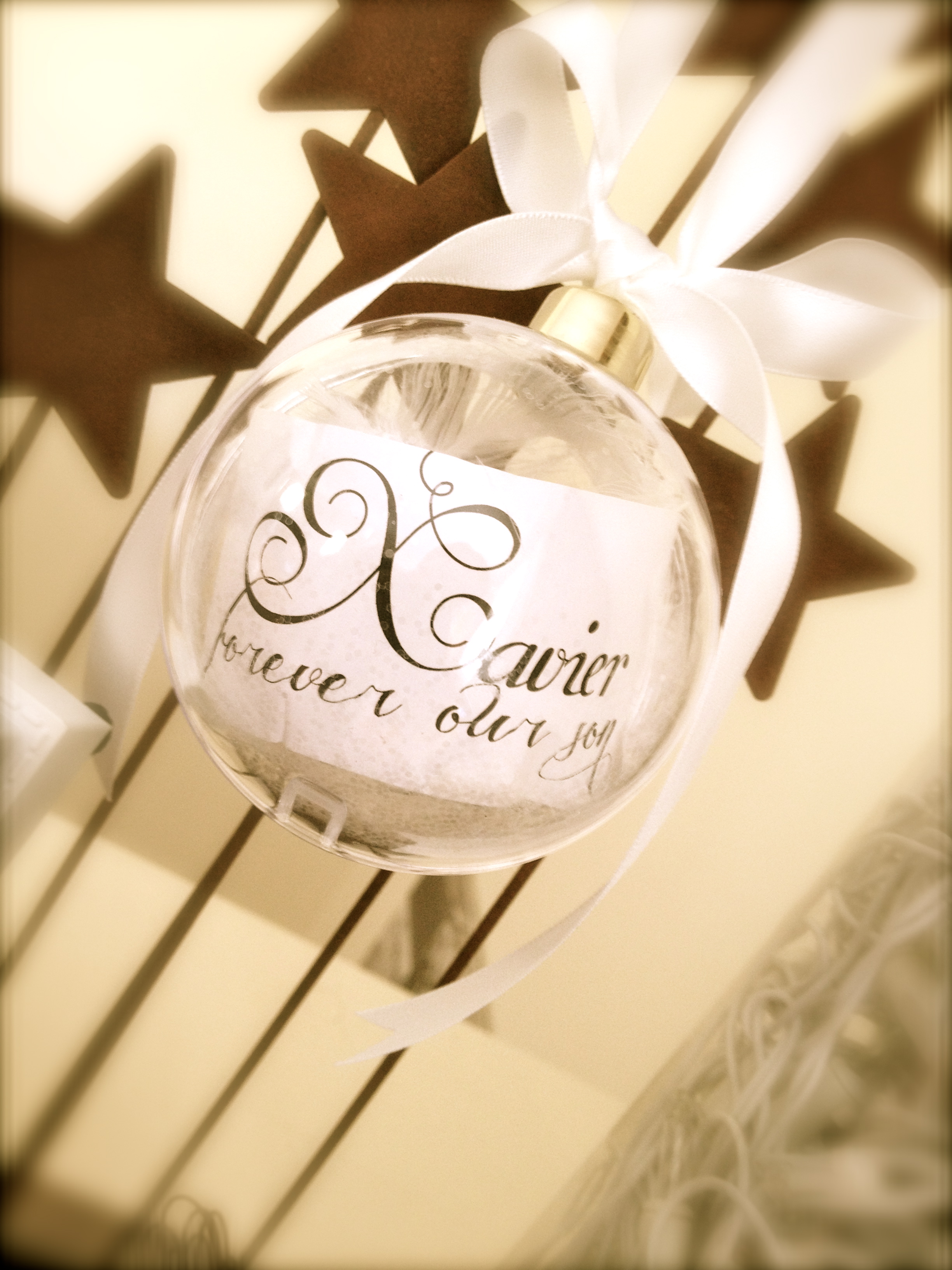 Little Xavier, as I think of you this Christmas season, I feel your comfort around our family. I try not to think of you, eighteen months old, tumbling around the Christmas tree. For that is not you. That memory belongs to someone else’s child and motherhood. To think of you that way is to invite pain. Instead, I catch glimpses of you in the twinkling lights, in the shining eyes of your brothers, in the embraces of family and friends and the very essence of Christmas that I once thought was lost forever. Merry Christmas little one.