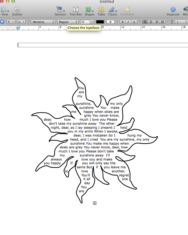 I used Pages on a Mac, and my instructions will be specific to that program, with an assumption that the reader is relatively well acquainted with the program. This blog post explains how you can do something similar in Word – http://irishitalianblessings.com/2013/02/add-text-to-shapes-in-microsoft-word.html